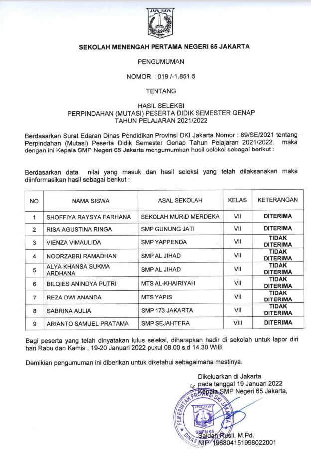 PENGUMUMAN HASIL SELEKSI PERPINDAHAN PESERTA DIDIK